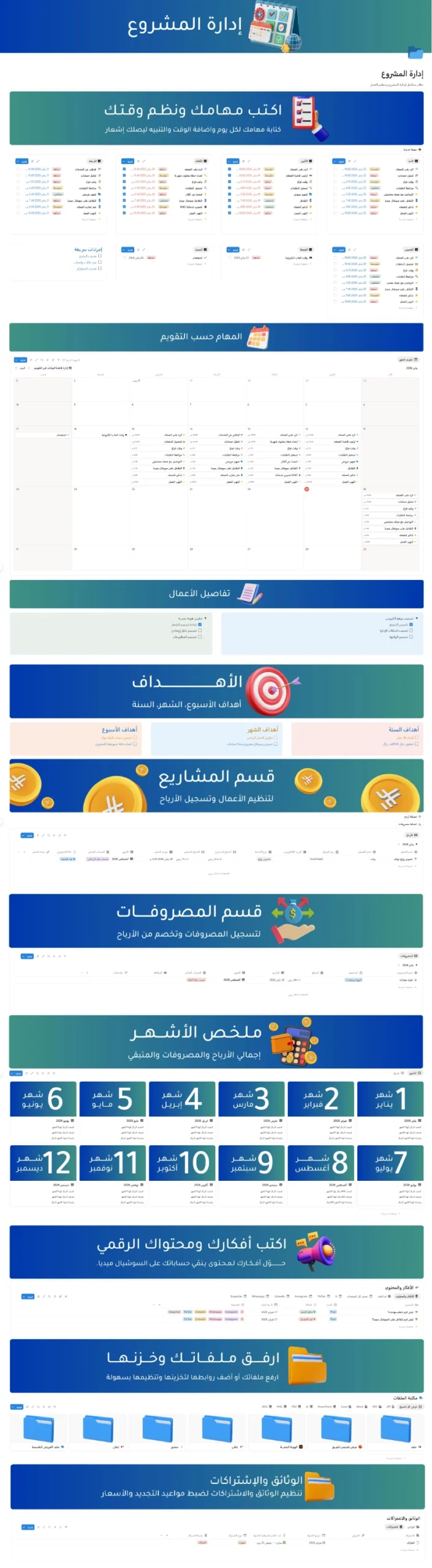 خطط أسبوعك، وتتبع مهامك وأهدافك وأرباحك في مكان واحد مع قالب إدارة المشروع؛ يوفّر لك لوحة مهام يومية مع تنبيهات، متابعة الأهداف السنوية والشهرية، تسجيل الأعمال والأرباح مع تصدير الفواتير، إدارة المصروفات بملخص شهري، وجدولة المحتوى مع إشعارات النشر.